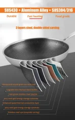 Introducing our top-of-the-line Stainless Steel Honeycomb Wok, engineered to revolutionize your cooking experience. Crafted with precision using food-grade 316L stainless steel and innovative honeycomb technology, this wok combines exceptional durability, superior non-stick performance, and versatile functionality to handle all your favorite recipes—from stir-fries and searing to steaming and deep-frying.