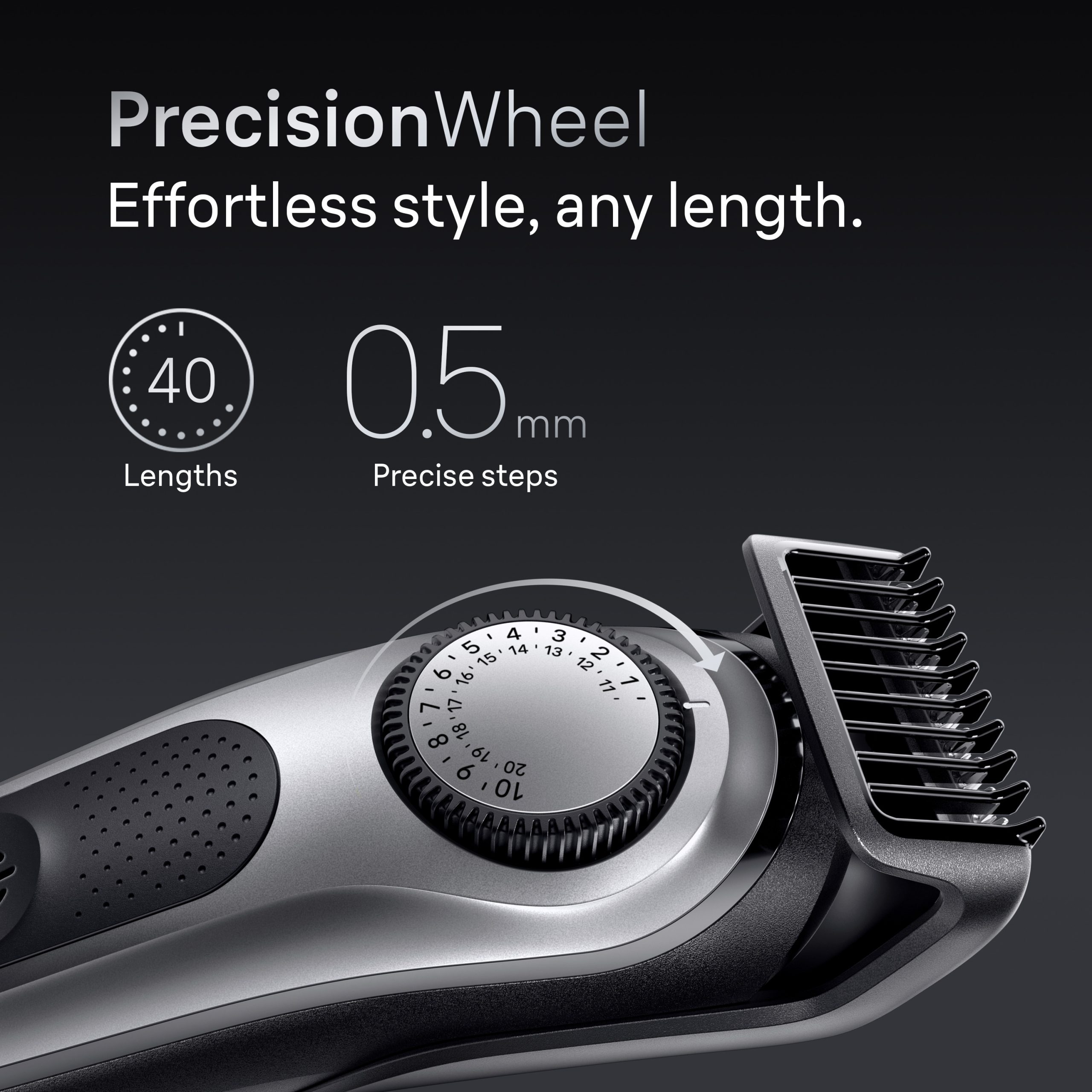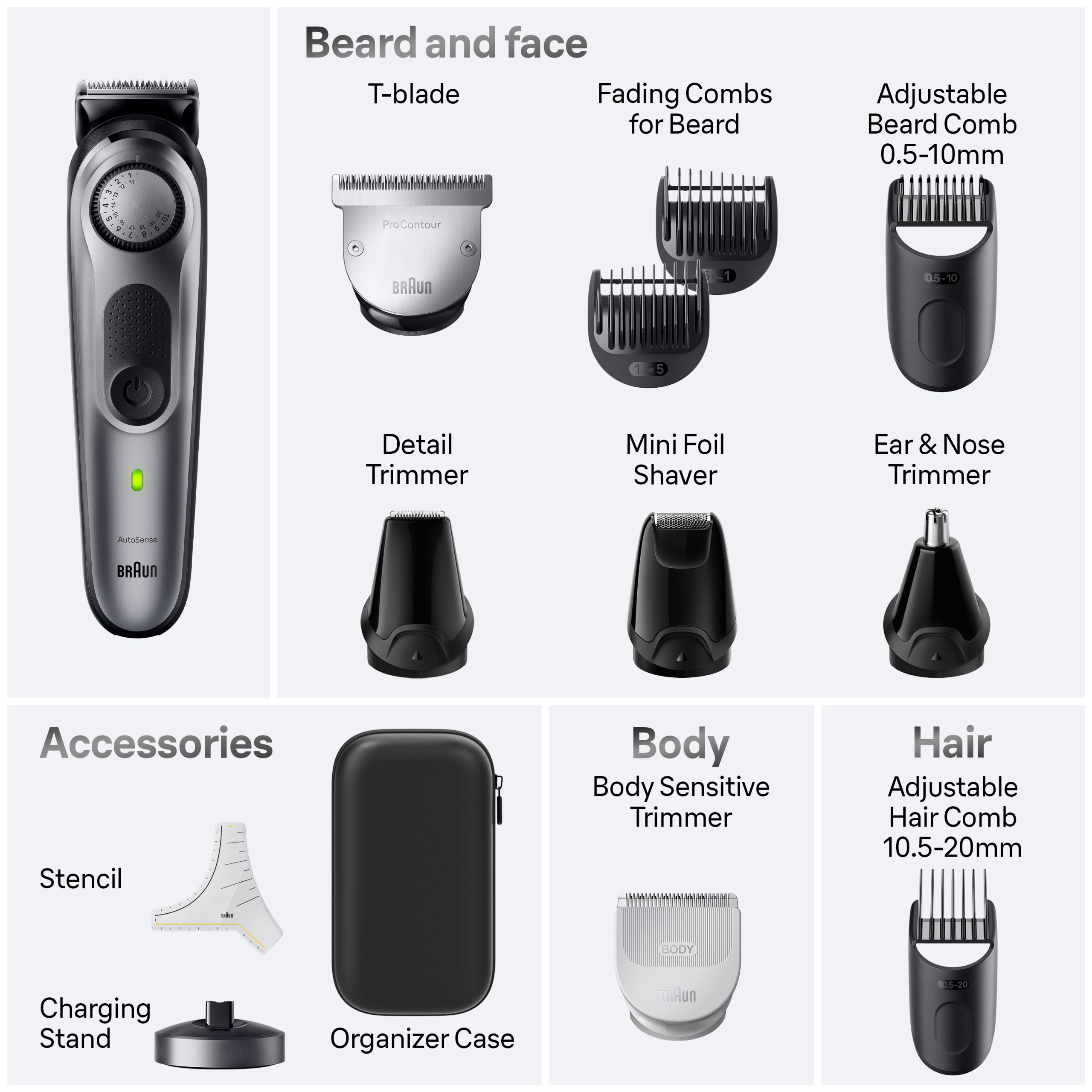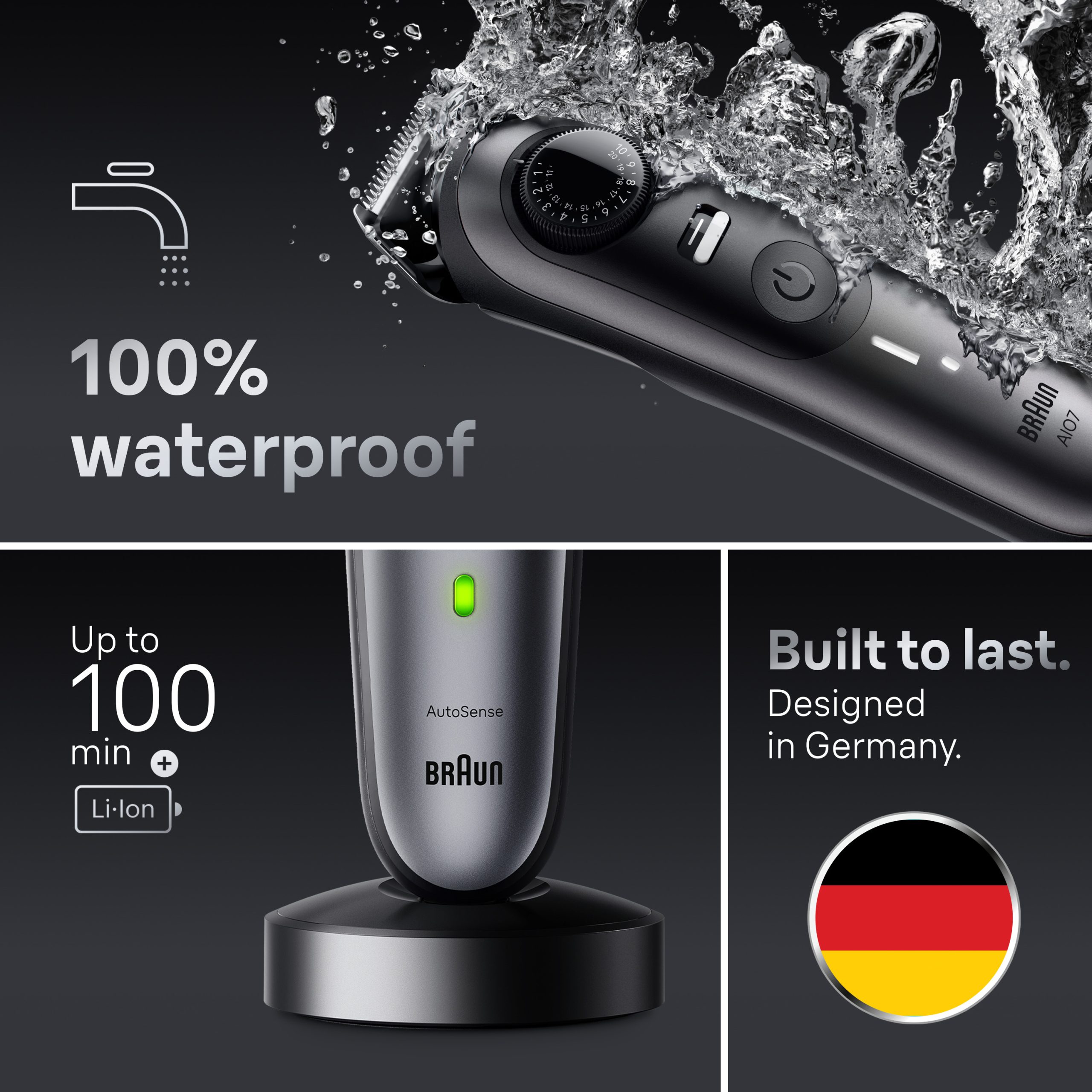 Braun Series 7 All-In-One Style Kit. For versatility and precision at home. With a beard, ear & nose trimmer, hair clippers and body groomer.Features the Precision Wheel with 40 length settings and our sharpest ProBlade. 100-minute cordless runtime.